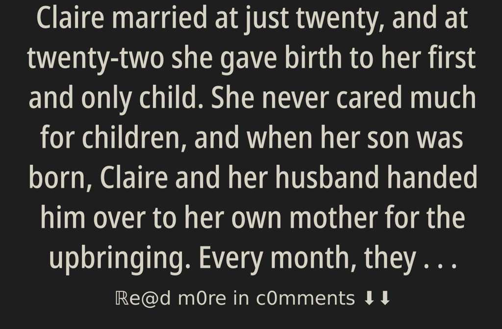 Claire married at just twenty, and at twenty-two she gave birth to her first and only child. She never cared much for children, and when her son was born, Claire and her husband handed him over to her own mother for the upbringing. Every month, they sent a bit of money, living freely and happily, unconcerned with their parental duties.