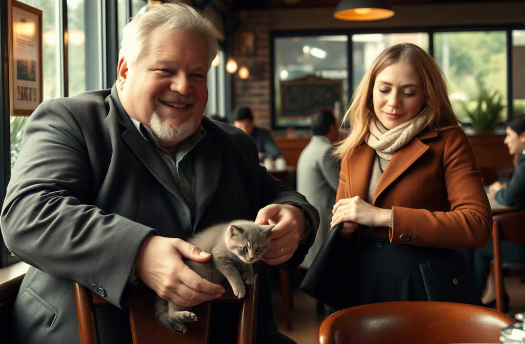 The waiter hurried over and offered to take the kitten away. But a man, close to six and a half feet tall, scooped up the crying fluffy creature and settled it on the neighbouring chair. A plate for my feline friend! he called. And bring your finest steak!