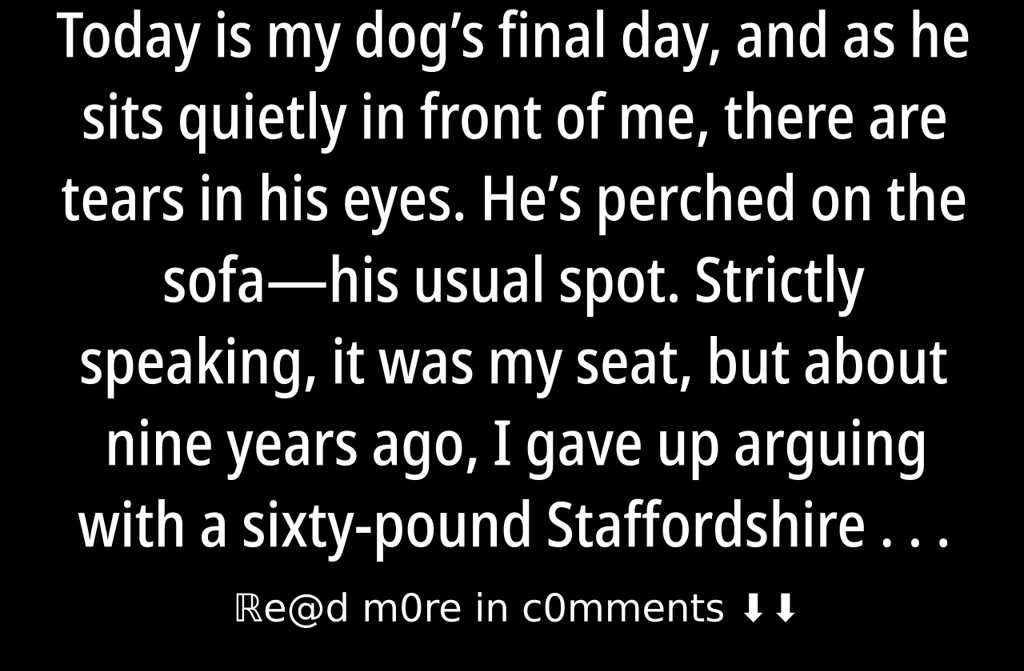 Today is my dogs final day, and as he sits quietly in front of me, there are tears in his eyes. Hes perched on the sofahis usual spot. Strictly speaking, it was my seat, but about nine years ago, I gave up arguing with a sixty-pound Staffordshire bull terrier over who truly owned the furniture. It was his from then on.