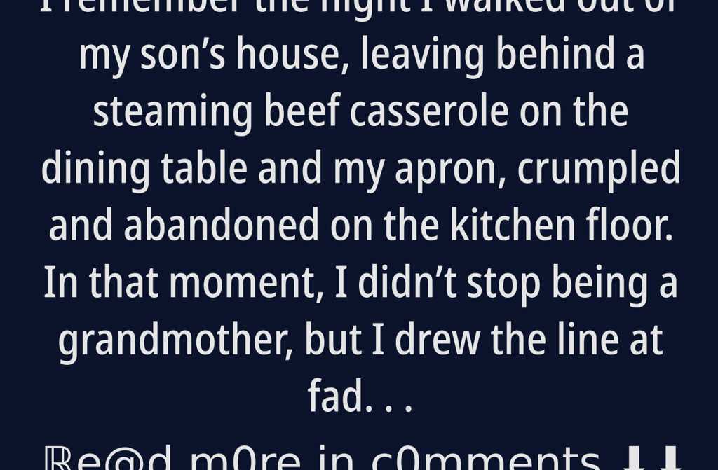 I remember the night I walked out of my sons house, leaving behind a steaming beef casserole on the dining table and my apron, crumpled and abandoned on the kitchen floor. In that moment, I didnt stop being a grandmother, but I drew the line at fading quietly into the background of my own family.