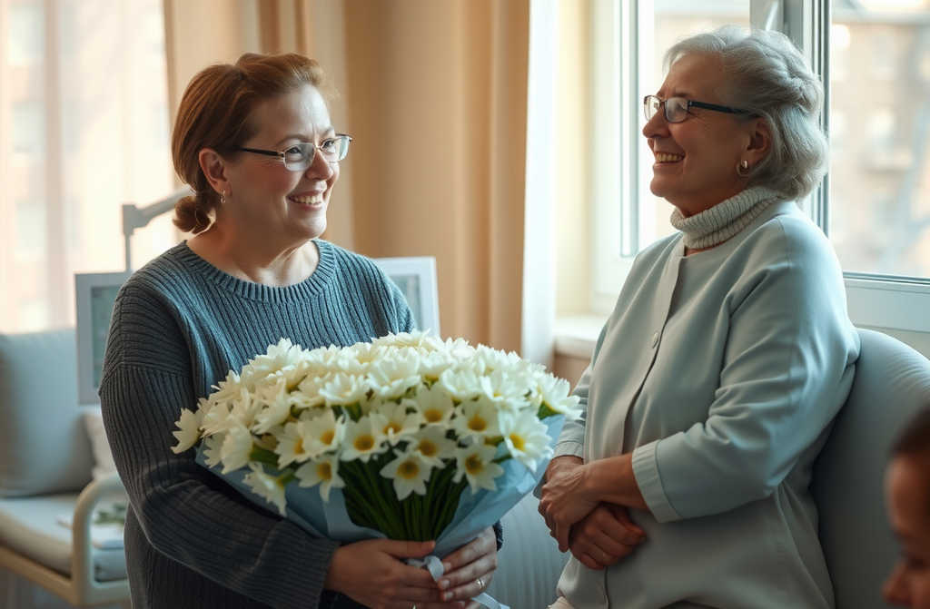 Hello! How are you? Im Victoria, your neighbour. Youve got a bit of a concussion, but the doctor said youll be fine. A courier dropped something off for you, and a young man with some flowers stopped by too. Victoria smiled warmly.