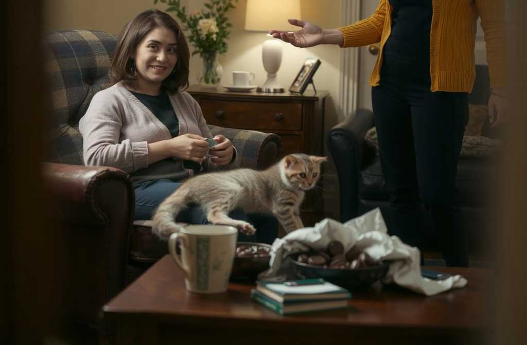 When Grace returned, balancing two mugs of strong coffee and an overflowing bowl of Quality Street, Lizzie was grinning from ear to ear, blissfully stroking a contented kittens fluffy belly. Pickle lay sprawled out, paws in the air, purring like a little lawnmower. The scratch adorned Lizzies wrist like a badge of honour, but her spirits hadnt dimmed a jot.