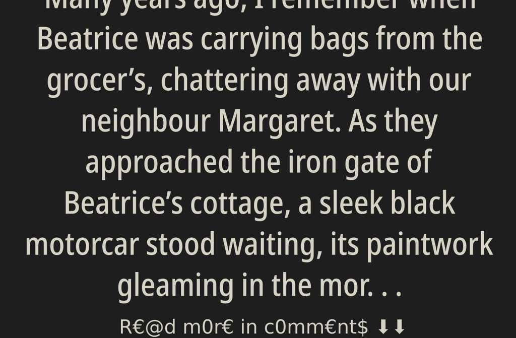 Many years ago, I remember when Beatrice was carrying bags from the grocers, chattering away with our neighbour Margaret. As they approached the iron gate of Beatrices cottage, a sleek black motorcar stood waiting, its paintwork gleaming in the morning light. Beatrice stood a little straighter, her voice tinged with pride.
