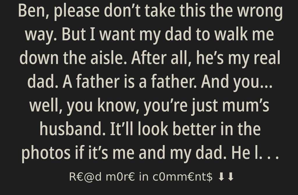 Ben, please dont take this the wrong way. But I want my dad to walk me down the aisle. After all, hes my real dad. A father is a father. And you well, you know, youre just mums husband. Itll look better in the photos if its me and my dad. He looks so smart in a suit.
