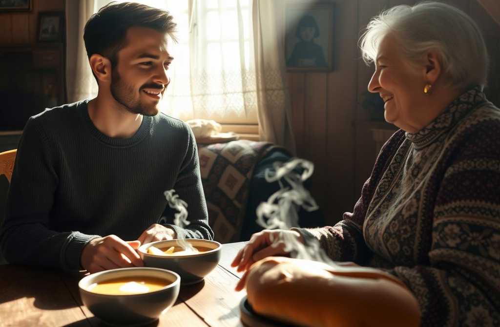 Peggy, without a word, pulled a cast-iron pot from the stove, glanced at the old clock on the wall as if hinting it was lunchtime, and ladled out a steaming bowl of rich beef stew with carrots and potatoes. She added a slice of buttered bread, a wedge of cheese, and, after a moment’s thought, set a bottle of homemade cider on the table. Her stooped frame, wrapped in a woolen shawl, seemed frail, but she moved confidently in her well-worn boots despite the warmth of the cottage.