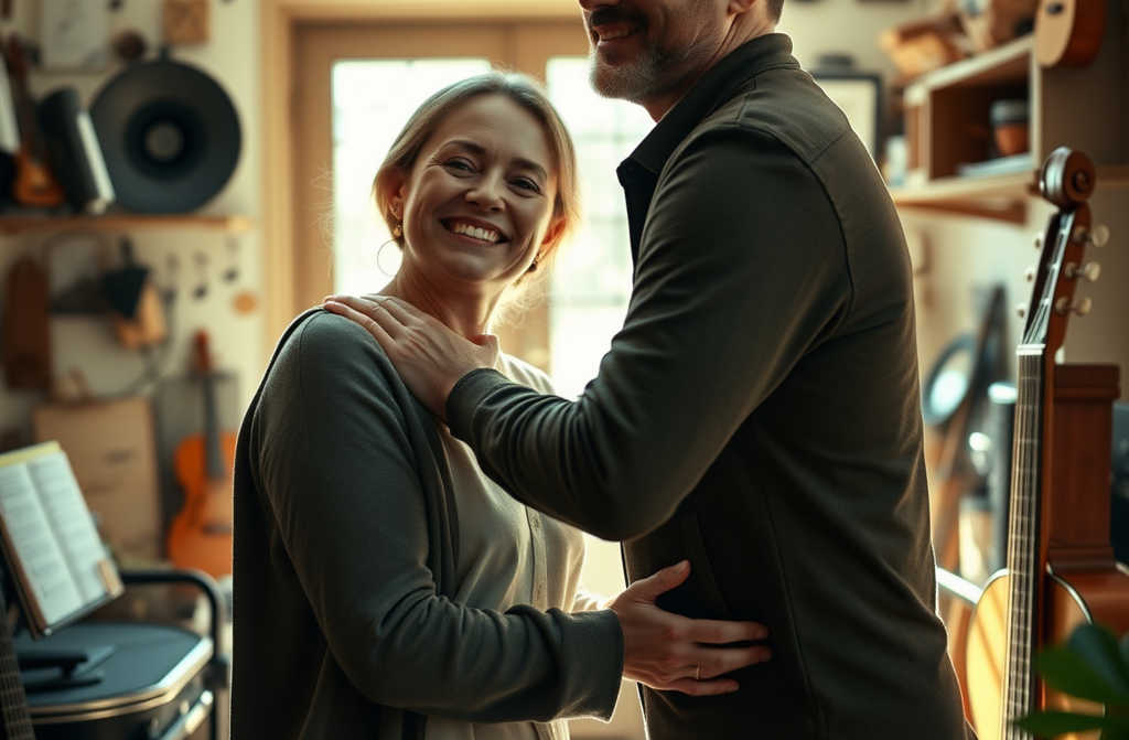 Tom comes into the studio while shes mixing a track, leaving a mug of coffee near her keyboard.