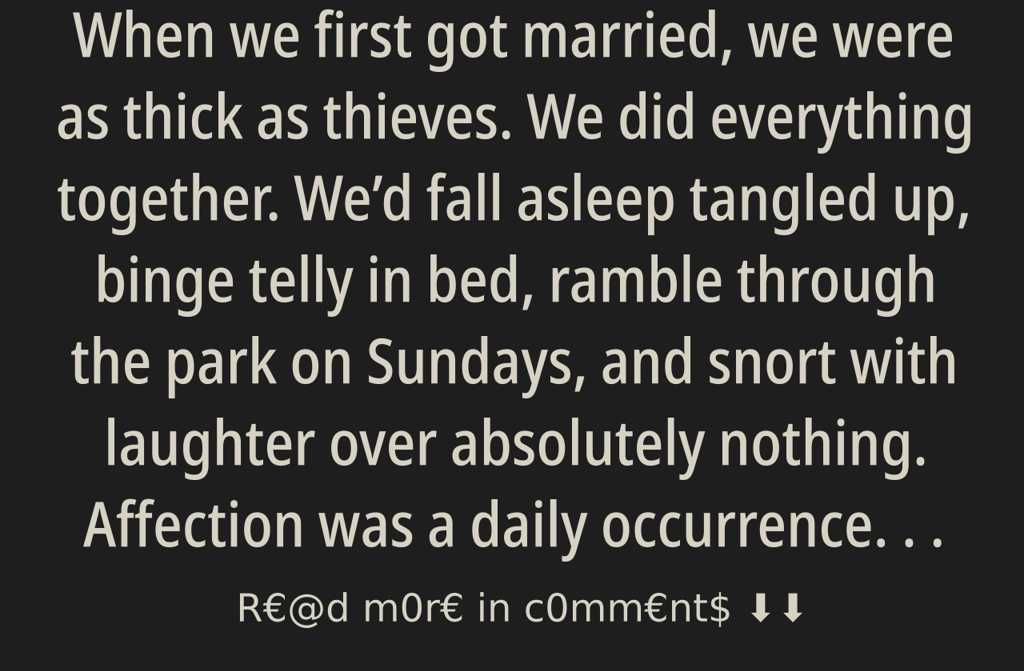 When we first got married, we were as thick as thieves. We did everything together. Wed fall asleep tangled up, binge telly in bed, ramble through the park on Sundays, and snort with laughter over absolutely nothing. Affection was a daily occurrence rarely scheduled, mostly a delightful surprise. I felt adored, wanted, chosen.