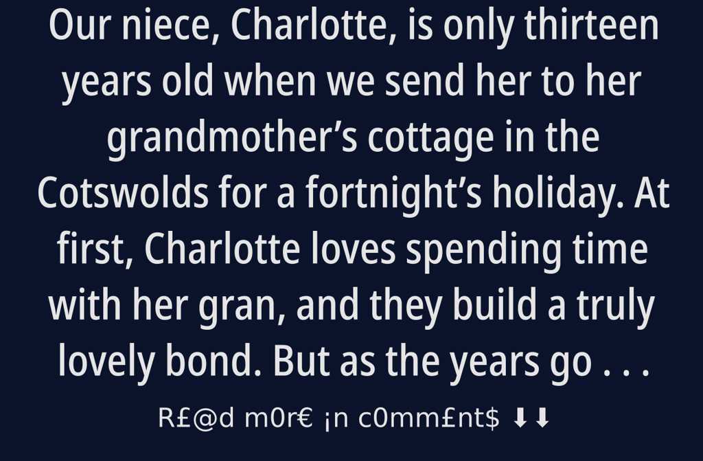 Our niece, Charlotte, is only thirteen years old when we send her to her grandmothers cottage in the Cotswolds for a fortnights holiday. At first, Charlotte loves spending time with her gran, and they build a truly lovely bond. But as the years go by, Charlotte grows older and the quiet charm of the countryside starts to wear thin for her. She misses her friends, the local cinema, and all the exciting activities she enjoys back home in London. Whats more, Charlotte is her grandmothers only granddaughter, and her visits have always brought a bit of happiness into her grans life.