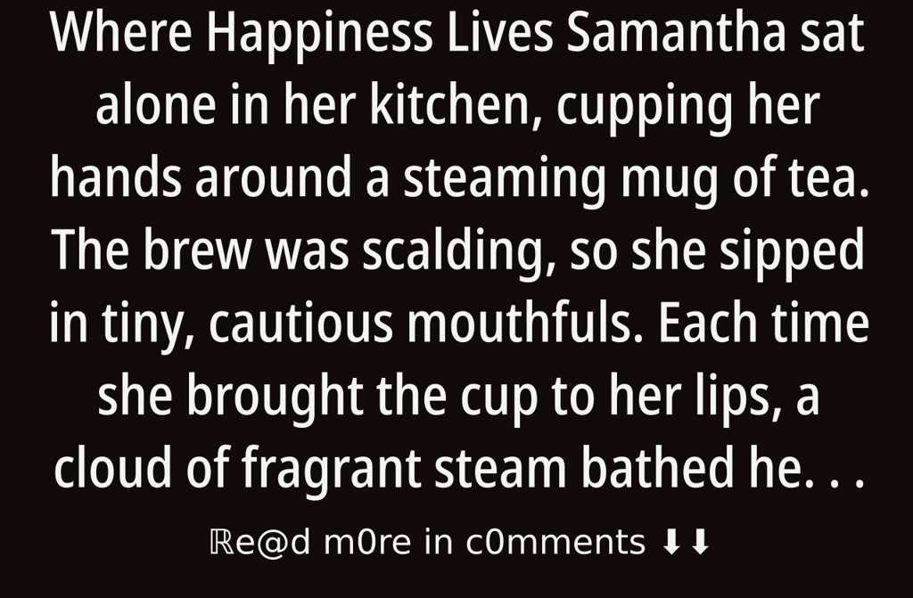 Samantha sat alone in her kitchen, cupping her hands around a steaming mug of tea. The brew was scalding, so she sipped in tiny, cautious mouthfuls. Each time she brought the cup to her lips, a cloud of fragrant steam bathed her face. Still, it did precious little for the chill inside herit was as if someone had left a window open in her chest.