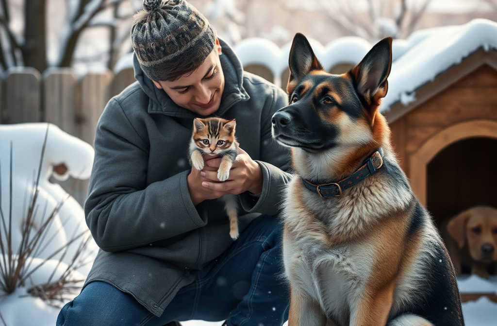 Curled up beneath a faded blanket, a tiny kitten shiveredits fur filthy, body trembling, breath barely stirring. Its eyes barely fluttered open, exhaustion and cold etched across its little face. Somewhere, Duke had found the kitten and, rather than driving it away or ignoring its plight, hed chosen to protect it, sleeping outside so the kitten would not be frightened, keeping vigil at the door as if he guarded the rarest treasure.