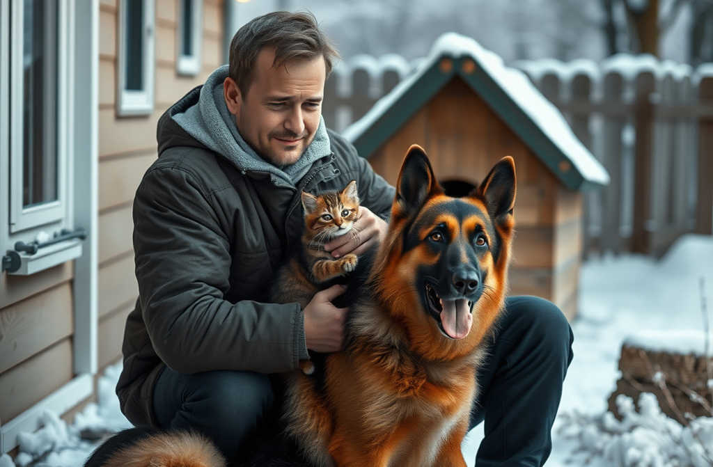 Inside, bundled in an old blanket, was a tiny kittendirty, half-frozen, barely managing to breathe. Its eyes flickered open weakly, its body trembling with cold. Somehow, Duke had found the little thing and, rather than chase it off or leave it to its fate, he had taken it in. Duke chose to sleep outside; guarding the entrance and refusing to scare the kitten, as though that kennel housed the most precious of treasures.