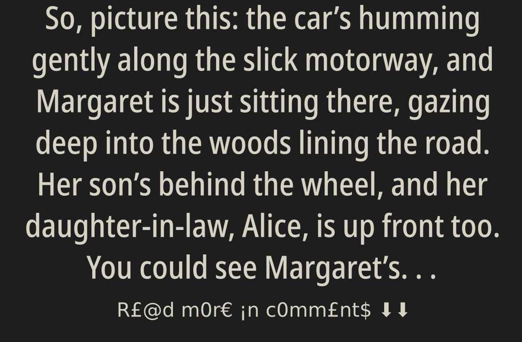 Husband, who did you leave behind? Me? The thoughts and silent calls to her lost love got louder in her mind, her throat tight with pain and grief, and the tears kept comingMargaret sighed, wiping her cheek quietly, determined not to let Anthony see her frailty. The forest whipped past, deep green and mysterious, and as the sun cast mottled shadows across her lap, another memory burst forthAnthonys giggle echoing across the garden, chasing butterflies as she watched, hands muddy, face bright. She closed her eyes, letting the hum of the car blur with those happier sounds.