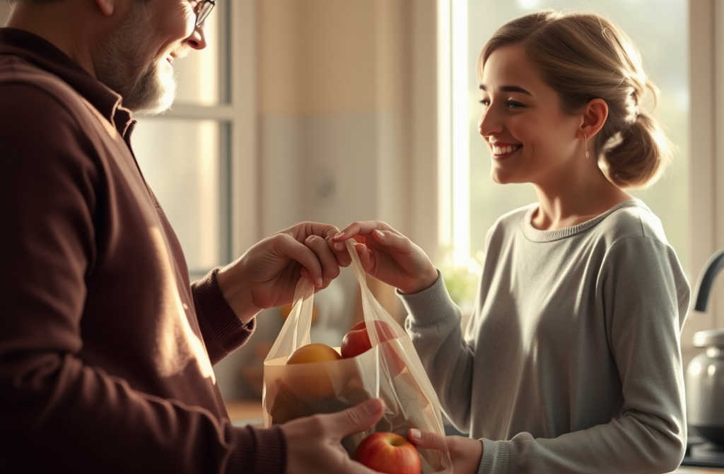 Hello, he answers, handing her the bag. Some apples. And He lifts the card. For you both.
