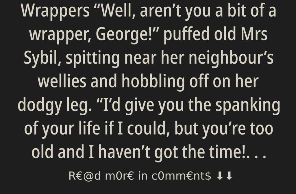 Well, arent you a bit of a wrapper, George! puffed old Mrs Sybil, spitting near her neighbours wellies and hobbling off on her dodgy leg. Id give you the spanking of your life if I could, but youre too old and I havent got the time! Youve reached your ripe years and still thick as two short planks!